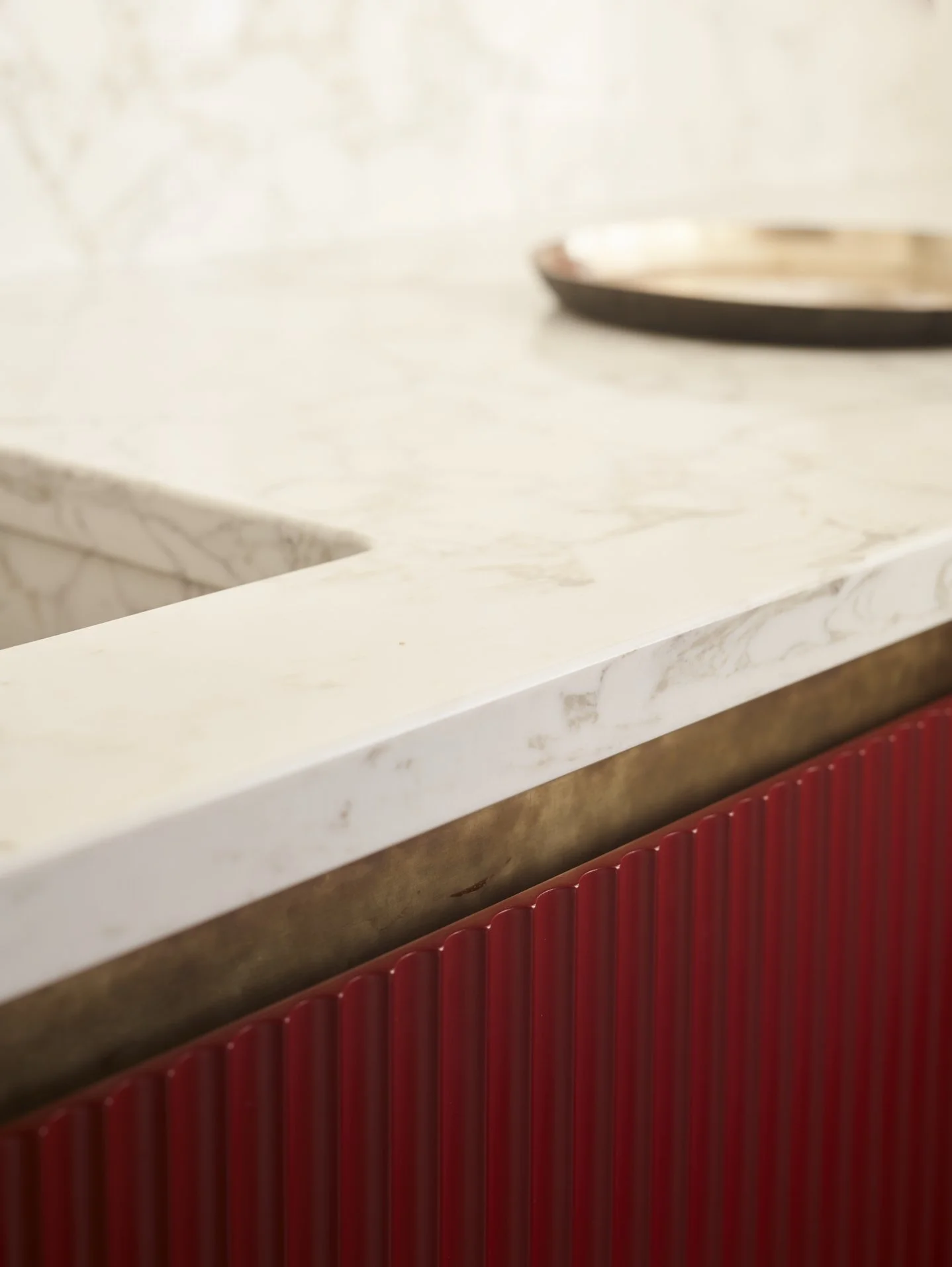 Materials and finishes: Farrow & Ball Incarnadine, antique brass, Arabescato Cremo Marble Effect Quartz.