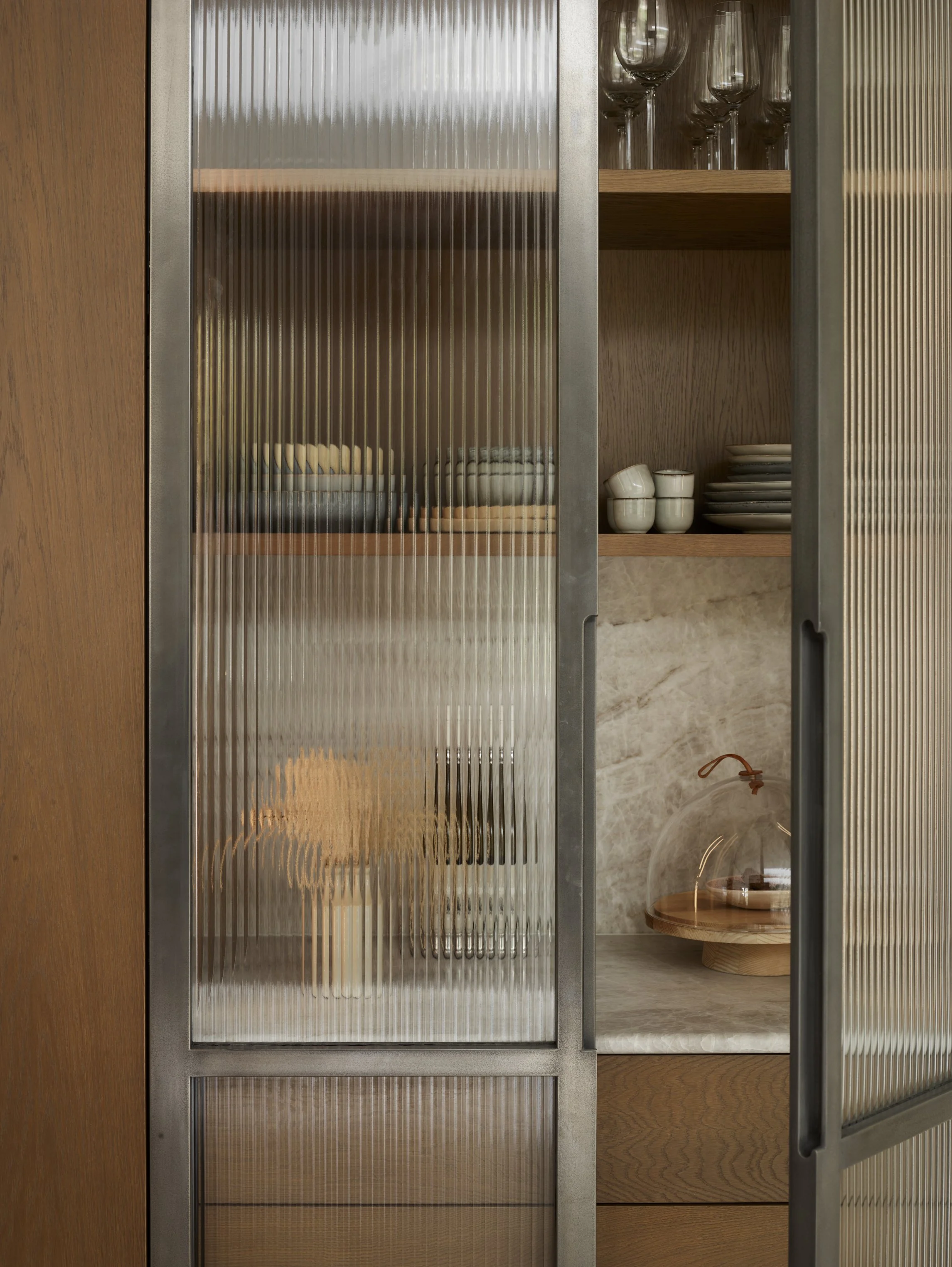 A luxurious kitchen designed for cooking, living and entertaining. The generous proportions are accentuated by elegant Art Deco–inspired detailing, while the expansive layout highlights the beauty of the materials – from the quartzite stone that stretches across the sweeping splashback and gracefully curved island to the rich, book-matched stained oak that adds depth and warmth to the bespoke cabinetry. Refined touches such as curved ribbed oak panelling on the island and gun metal-finished pantry doors make this a timeless space imbued with sophistication and character.